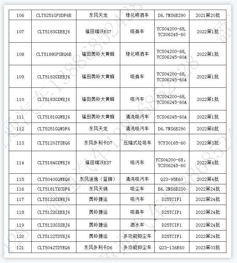 | 121 | CLT5042TDYEQ6 | 東風多利卡D6 | 多功能抑塵車 | Q23-136E60 | 2023第03批 |