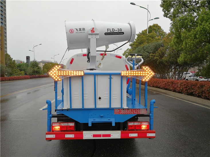 灑水車前裝有鴨形噴嘴或圓頭沖嘴,后面裝有圓柱開灑水噴嘴或蓮蓬頭噴嘴,后部有一工作平臺,裝配有水炮。帶消防接頭,帶自流閥,帶自吸功能,選配20米綠化消防卷盤。