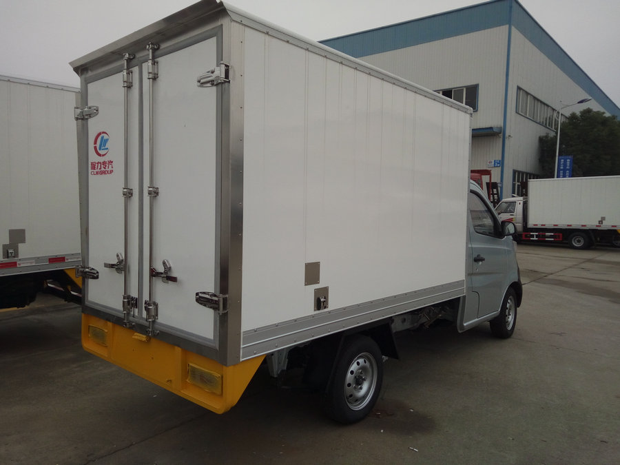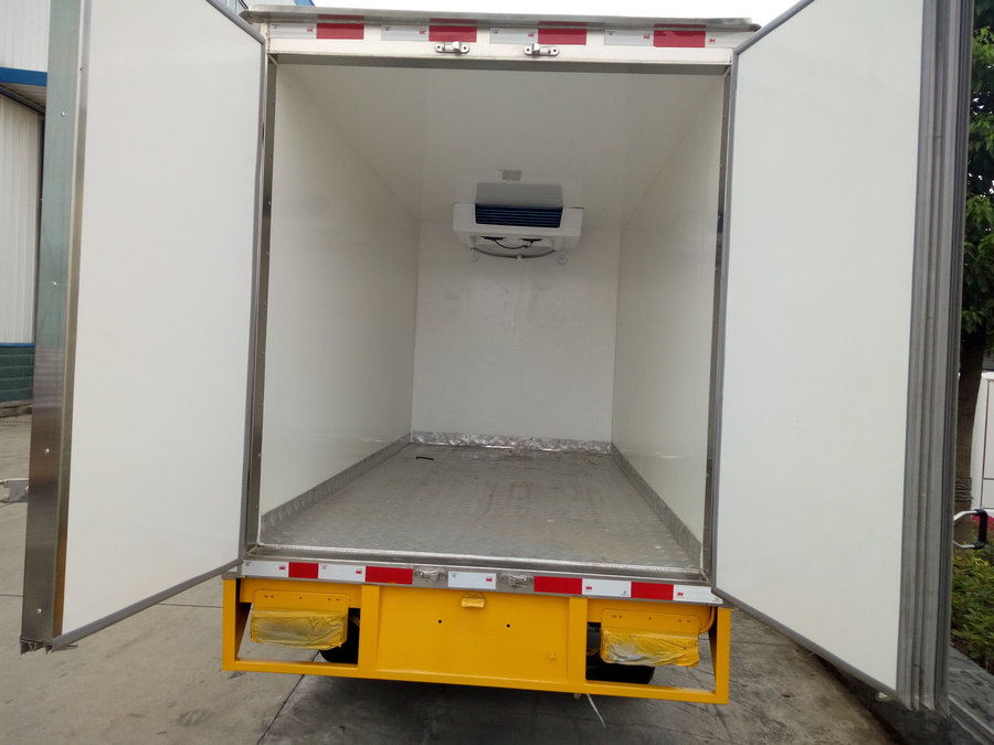 冷藏車廂體:采用國標A級聚氨酯保溫材料,厚度為8厘米,廂體內外采用玻璃鋼材質全包裹。不銹鋼鎖件。包角、包邊鋁合金型材。底盤采用高強度花紋鋁板定制。可選裝肉鉤導軌,和底部通風槽。