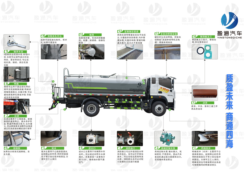 該車主要用于城鄉園林綠化噴灑作業.主要裝置為罐體及噴灑裝置.罐體總容量:20.45立方米;罐體有效容積:19.47立方米;罐體外形尺寸(×長軸×短軸)(mm):7300×2450×1650.僅采用軸距(mm):1850+3200+1350改裝.側、后防護材料均為:Q235碳鋼,連接方式均為:螺栓連接,后部防護截面尺寸(mm):120×50,后部防護離地高度(mm):490.ABS生產廠家:東科克諾爾商用車制動系統(十堰)有限公司,浙江萬安科技股份有限公司,型號:3631010-C2000,VIE ABS-Ⅱ.選裝前部不帶電子霧炮.選裝電子炮裝置樣式.當前部選裝電子炮裝置時,前伸為500mm,整車長度為11230mm,11750mm.