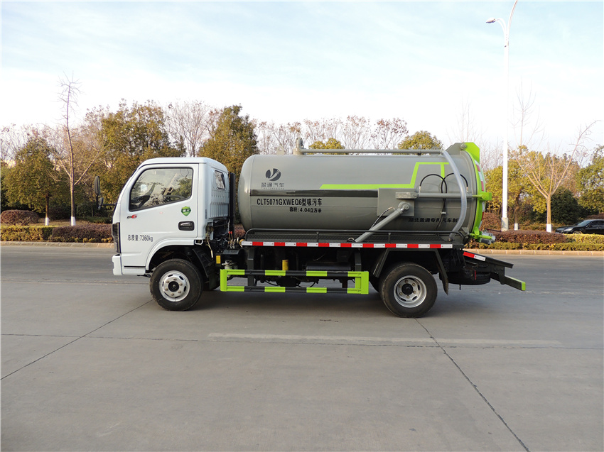 東風5方吸污車,多利卡5方吸污車,抽排運污車,糞便液態吸糞車,泥漿液態轉運車,主要專用裝置:罐體及吸污裝置,該車用于吸除水坑、下水道里污濁物;該車具有舉升功能;罐體總容量4.04立方米,罐體有效容積3.85立方米,罐體外形尺寸(總長×直徑)(mm):3800×1300;ABS型號及生產廠家:3550D-1010C2000/東風福利企業公司;/后防護材料Q235碳鋼,側防護采用螺栓連接,后防護采用焊接連接,后防護截面尺寸(×)(mm)50×120,后部防護離地高度(mm):420.僅采用底盤3300mm軸距改裝.選裝側面樣式,隨底盤選裝水箱、空濾尿素罐、電瓶框等位置布局.
